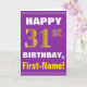 This simple birthday-themed greeting card design features a warm birthday wish like "HAPPY 31st BIRTHDAY, First-Name!" on the front, in bold text on a purple colored background. The birthday number has a faux/imitation gold-like coloring look. The name on the front can be customized. The inside features a birthday message that can be customized. A greeting card like this could be a fun way to deliver birthday wishes to somebody who is celebrating their thirty first birthday. [~Z0000277]