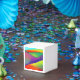 Digital watercolor landscape design in vibrant rainbow colors and textures with a curved hills and lines.