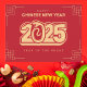 Celebrate the Year of the Snake in 2025 with this striking postcard featuring bold red and gold accents. The modern typographic design proudly displays “2025” intertwined with a sleek snake silhouette, symbolizing wisdom and prosperity. Traditional corner motifs add an elegant touch, creating a timeless blend of modern and classic. Perfect for sharing holiday greetings with friends, family, or colleagues who appreciate the excitement of fresh beginnings. Send this festive design to usher in a bright and prosperous Lunar New Year.