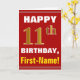This simple birthday-themed greeting card design features a warm birthday wish like "HAPPY 11th BIRTHDAY, First-Name!" on the front, in bold text on a red colored background. The birthday number has a faux/imitation gold-like coloring appearance. The name on the front can be customized. The inside features a birthday message that can be customized. A greeting card like this could be a fun way to deliver birthday wishes to somebody who is celebrating their eleventh birthday. [~Z0000276]