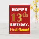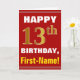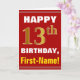 This simple birthday-themed greeting card design features a warm birthday wish like "HAPPY 13th BIRTHDAY, First-Name!" on the front, in bold text on a red colored background. The birthday number has a faux/imitation gold-like coloring appearance. The name on the front can be personalized. The inside features a birthday message that can be customized. A greeting card like this could be a fun way to deliver birthday wishes to somebody who is celebrating their thirteenth birthday. [~Z0000276]