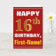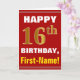 This simple birthday-themed greeting card design features a warm birthday wish like "HAPPY 16th BIRTHDAY, First-Name!" on the front, in bold text on a red colored background. The birthday number has a faux/imitation gold-like coloring look. The name on the front can be personalized. The inside features a customizable birthday message. A greeting card like this could be a fun way to deliver birthday wishes to somebody who is celebrating their sixteenth birthday. [~Z0000276]