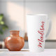 A bold red personalized monogram latte mug for a girl or guy who loves simple, handwritten gifts. Beautiful cursive script down the side of your bottle spelling out your name.