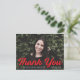 Simple and stylish graduation thank you postcard featuring the graduate's horizontal photo with "Thank You" in a bold red script. Personalize the front of the photo graduation thank you postcard by adding the graduate's name, school name, and graduation year. The postcard reverses to display your return address and custom thank you message.