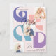 Celebrate your Graduate with this Retro 3 photo graduation announcement card. The design features bold 'GRAD' typography in purples, peachy pink and turquoise in a modern collage layout. Room for text on back for additional information or to add invitation info.