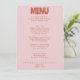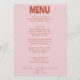 A colorful retro funky modern bright wedding dinner menu. Which features chic template design of boho vintage bubble pink background and bold typography menu in rust .. Perfect and matching with the whole suite.