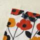 The image features a vibrant floral pattern with stylized red and orange flowers, each with bold black centers. The flowers are connected by thin black stems and leaves, all set against a light background. The design is minimalistic yet striking, evoking a retro or mid-century modern aesthetic with its clean lines and contrasting colors.