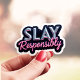 Add some cheeky charm to your laptop, planner, or water bottle with this bold Slay Responsibly sticker. Featuring fun retro metallic lettering over a starry background, this design pops on any surface. Printed on high-quality, durable material that is perfect for daily use. Great for gifting to your favorite boss babe, creative, or sticker lover. Slay your style while keeping it classy.