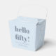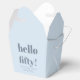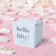 This party favor box features a soft light blue background with "hello fifty!" in large bold lettering on the front, along with the honoree's name, event date, and venue in script and spaced capitals below. The clean blue and gray palette gives it a modern, grown-up feel that works beautifully for a milestone birthday celebration. A great pick for a 50th birthday party favor or guest gift.