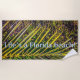 This Beach Towel features original, abstract artwork by ZoeSPEAK, made from Zoe’s original photograph of a reclinata palm frond. The strong Florida sun highlights the leaves, which grow out from the spine like stripes in diagonal rows. The lawn, in soft focus, forms the green background. There is optional text reading “Life’s a Florida beach!”, which can be personalized or deleted if you prefer.
