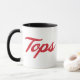 The Tops logo is rendered in a vibrant red, showcasing an energetic and bold cursive script that exudes confidence and movement. The sleek, rounded lines give it a friendly and dynamic look, suitable for representing sports teams, events, or athletic branding. The black outline provides a sharp contrast, emphasizing the smooth, flowing design of the text and ensuring its visibility. The overall feel of this logo suggests enthusiasm and spirit, making it memorable and engaging for fans and audiences alike.