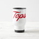 The Tops logo is rendered in a vibrant red, showcasing an energetic and bold cursive script that exudes confidence and movement. The sleek, rounded lines give it a friendly and dynamic look, suitable for representing sports teams, events, or athletic branding. The black outline provides a sharp contrast, emphasizing the smooth, flowing design of the text and ensuring its visibility. The overall feel of this logo suggests enthusiasm and spirit, making it memorable and engaging for fans and audiences alike.