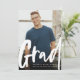 Celebrate your high school or college graduate with this vertical one-photo announcement that also includes room on the back for graduation party invitation text. The modern script "grad" on the front in white is perfect for a trendy grad. The backer is navy blue, but the color can be changed to any school color by clicking "customize."