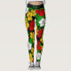 Bold floral leggings patterned with red, yellow and white tropical Hibiscus flowers, and green palm fronds, on black. There's customisable text across the front waistband, where you can add your own name or slogan