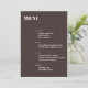 This wedding menu card features a rich brown background with ivory typography and a clean, easy-to-read layout for reception tables. Customize the wording to list appetizers, dinner options, and dessert so guests know what to expect throughout the meal. The vertical format works well for plated dinners, buffets, or family-style receptions. A polished paper detail that complements modern and minimalist wedding decor.