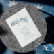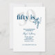 Bold typography with calligraphy 50 is nifty birthday party invitations in blue and white. The back features an all blue background with white spots/bubbles to emulate the bubbles in wine and champagne to celebrate how we age like a find wine. All text is completely customizable.