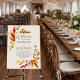 Beautiful bold watercolor fall leaves decorate the sides of this boho autumn wedding foam board. Gorgeous shades of red, orange, and brown form the botanical border of this cream sign. A modern bohemian design with bright, fun colors.