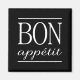 Black square magnet with a BON APPETIT kitchen quote typography print. Matching home decor available.