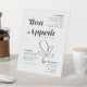 These vintage style 8.5 x 11" wedding dinner pedestal sign menus with black lettering and a stylized heading, "Bon Appetit," in large black letters with a heart accent on a neutral background. The menu has placeholders for 2 appetizers, 2 entrees, and 2 desserts and the wedding couple names.