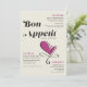 These vintage style 5" x 7" wedding dinner paper sheet menus black lettering with a stylized heading, "Bon Appetit," in large black letters with a magenta heart accent on an cream background. The menu has placeholders for 2 appetizers, 2 entrees, and 2 desserts and the wedding couple names.