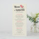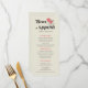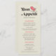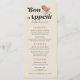 These vintage style 4" x 9" wedding dinner menus feature black and salmon pink lettering with a stylized heading, "Bon Appetit," in large black letters with a salmon pink heart accent on an cream background. The menu has placeholders for 2 appetizers, 2 entrees, and 2 desserts and the wedding couple names.