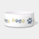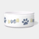 Pet bowl for dog with bones, blue bows and blue paw prints.
