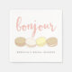Bonjour! Add a touch of Parisian style to your bridal shower with these pretty cocktail napkins. Design features four delicious French macaron illustrations in pastel pink, ivory, tan and pale yellow, with "Bonjour" in peachy pink handwritten style script lettering. Customize with the guest of honor's name for a personalized touch.