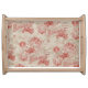 Large natural wood finish serving tray with an image of rose flowers, vignettes of women in rose floral circles, rose fleurs de lis, and French words and phrases on a cream and tan floral background. See the entire Cancan Serving Tray collection in the FOOD/BEV | Serving Trays section.