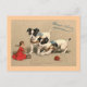 Cute vintage French New Year card showing two puppies playing with a doll and a ball of wool. The card message is "Bonne Annee".
