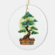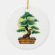 traditional watercolor painting of a japanese bonsai tree growing from a brown pot in front of the yellow sun on a ceramic ornament.