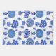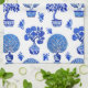 Tea towel in a pattern of whimsical bonsai trees in Chinese porcelain planters, in traditional shades of deep to light cobalt blue, on a white background