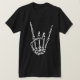 Pen & ink drawing of a skeleton hand in the heavy metal rock salute gesture. B/W graphic, on t-shirts, hoodies, buttons, stickers, cards, gifts.