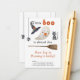 Featuring cute watercolor of baby ghost and Halloween aesthetics. A little boo is almost due! Halloween themed baby shower with watercolor ghost, black cat, witch's hat, magic mop ( broomstick ), spider hanging from a web. The little ghost is eating a lollipop.