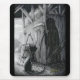 A spooky boo kitty stares at an ominous shadow reaching for the scythe in the barn. From the October 2020 ink art challenge sketchbook of Amanda Diehl, Paxdomino Designs.