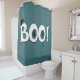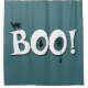 Boo! text design for Halloween with cat, spider, owl and spider net decoration on blue background.