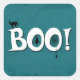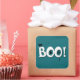 Boo! text design for Halloween with cat, spider, owl and spider net decoration on grunge blue background.