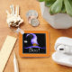 Fun Halloween keychain features watercolor illustration of a purple witch hat with hanging spider and white customizable "Boo!" text on black background