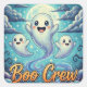 This whimsical sticker features cute smiling ghosts floating under a glowing full moon amid swirling stars and twisted trees, with "Boo Crew" in playful orange script, evoking friendly Halloween fun. Finished as an oil paint art print.