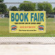Book Fair banner sign for your school, library, or other event about books and reading. Large blue BOOK FAIR letters are attention-getting from a distance against a yellow sun rays background. Edit all the other text lines to your custom book event information. Order outdoor quality banner if for outdoor use.