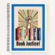 Protest banning books with this image that features a shelf of banned books, a protesting raised fist, a burst of color rays and the words "Book Justice" in a retro font. Accented by a border of rich blue. Looks great!