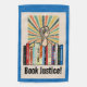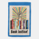 Protest banning books with this image that features a shelf of banned books, a protesting raised fist, a burst of color rays and the words "Book Justice" in a retro font. Accented by a border of rich blue. Looks great!