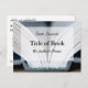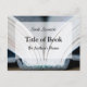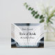 A photograph of a book's spine serves as a background for this book launch postcard.