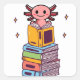 Bookworm Axolotl is enjoying reading and sitting on a pile of books.