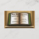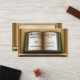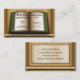 © Sunny Mars Designs. Book on Wooden Bookshelf Bookstore Business Cards – This custom printed book shop business card template features a vector illustration of a green hardcover open book on a wooden book shop book shelf and a metal plate sign on the back. The business cards are fully customizable. Enter your own name and business details.