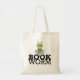 A cute tote featuring a worm reading a book with the words - Book Worm.
