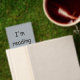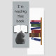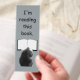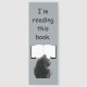Black cat in front of open book. Text above reads "I'm reading this book." Reverse side shows a shelf of books.