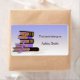Custom book nameplate labels with a stack of books on a purple background. Personalized with your name, and change the text if you wish. Great for any book lover to help keep track of your books!