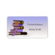 Custom book nameplate labels with a stack of books on a purple background. Personalized with your name, and change the text if you wish. Great for any book lover to help keep track of your books!
