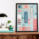 Add a fun touch to library or book nook decor with this poster which features illustrations of bookmarks in shades of coral, teal blue, tan and sage green against a light mint green background.