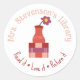 White round classroom library stickers featuring a vase with a flower on top of a stack of books . Personalize it with the teacher's name and your text .
